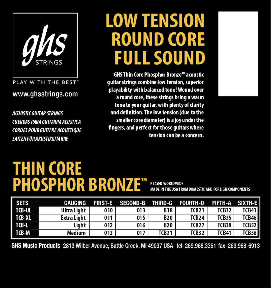 GHS Thin Core Phosphor Bronze acoustic guitar strings combine low tension, superior playability with balanced tone! Wound over a round core, these strings bring a warm tone to your guitar, with plenty of clarity and definition. The low tension (due to the smaller core diameter) is a joy under the fingers, and perfect for those guitars where tension can be a concern. • MFSKU TCB-L • UPC 737681447779