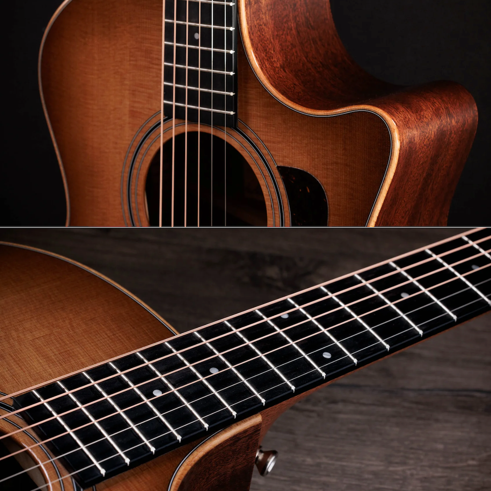 6-String | Torrefied Spruce Top | Sapele Back and Sides | Neo-Tropical Mahogany Neck | West African Crelicam Ebony Fretboard | Expression System 2 Electronics | Venetian Cutaway Crafted with all-solid tonewoods, tone-enhancing interior bracing and a striking sunburst finish, the Taylor 314ce Studio makes pro-quality sound more accessible than ever. This versatile, comfortable Grand Auditorium acoustic-electric boasts back and sides of solid sapele, a mahogany-like tonewood with a warm, punchy midrange voice. A solid top of torrefied Sitka spruce yields bold projection and a warm, aged-in quality thanks to our special roasting recipe, while our V-Class bracing adds more volume, longer sustain and clearer harmony between notes all the way up the neck. A narrower nut width of 1-11/16 inches and our slender neck profile makes for buttery-smooth fretting at any skill level, and the onboard ES2 electronics make it easy to plug in and play with clear amplified tone. This model is finished with an attractive shaded edgeburst top treatment and an all-gloss body, and includes a structured gig bag for convenient storage and portability. • MFSKU 314ce Studio SEB • UPC 887766134589