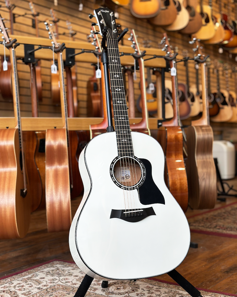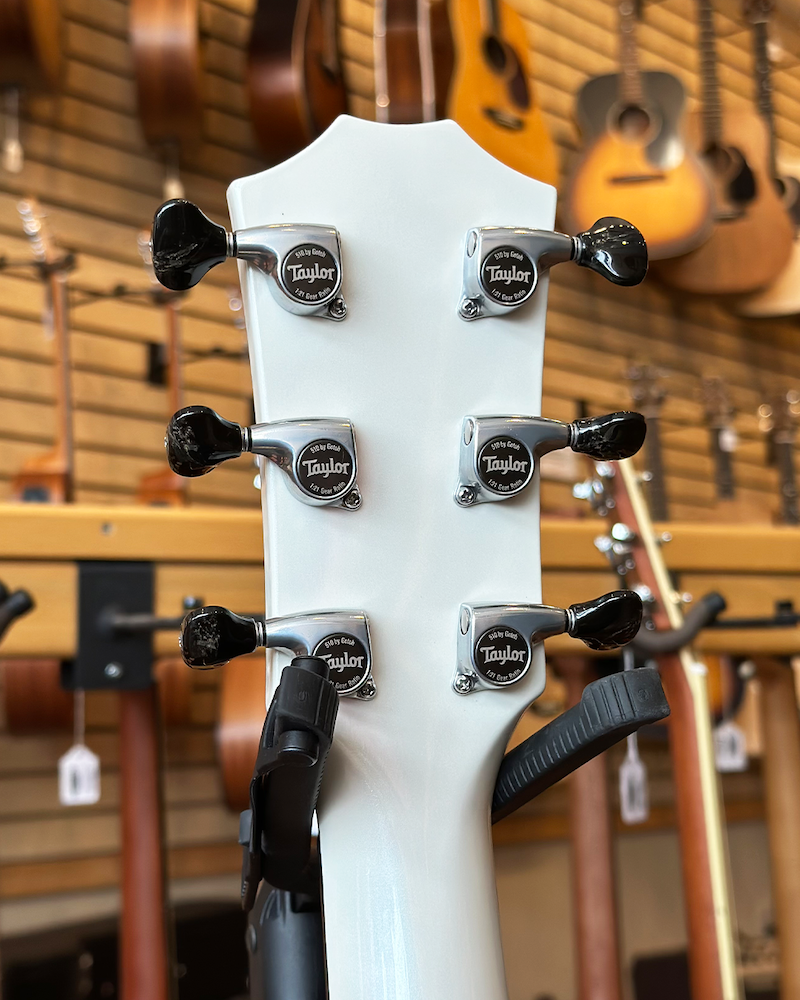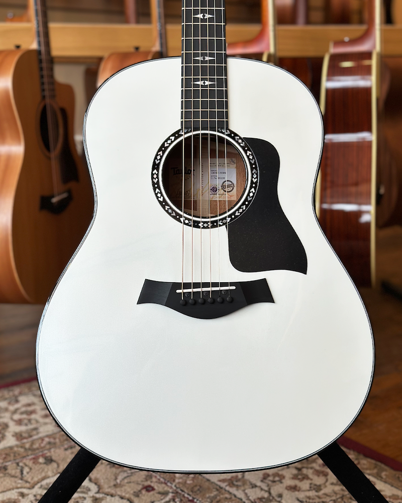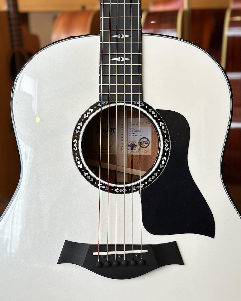 Taylor Custom Shop NAMM 2025 Custom #5: C17e B5005 Grand Pacific – Torrefied Sitka/Mahogany – Pearl White with Hardshell Case. Built for the 2025 NAMM Show, this Taylor Custom Shop Grand Pacific is a visually striking and sonically powerful acoustic crafted for discerning players and collectors alike. Custom #5 (C17e B5005) pairs hand-selected solid mahogany back and sides with a torrefied Sitka spruce top, delivering a rich, seasoned tone right out of the case. The torrefied top adds vintage warmth and openness, while the mahogany body brings focused mids and a woody punch—perfect for everything from fingerstyle to heavy strumming. Inside, Taylor’s revolutionary V-Class bracing enhances sustain, volume, and tonal clarity across the entire fretboard. The Pearl White gloss finish makes a bold visual statement, complemented by refined appointments including mother-of-pearl Progressive Diamond inlays, a mother-of-pearl and ebony Nations rosette, ebony body binding, and crisp black/white edge trim. Premium Gotoh 510 tuners (antique chrome with black buttons) ensure ultra-smooth, precise tuning, and Taylor’s proprietary ES2 electronics let you plug in and perform with confidence. Ships in a Western Floral deluxe hardshell case. Specs: