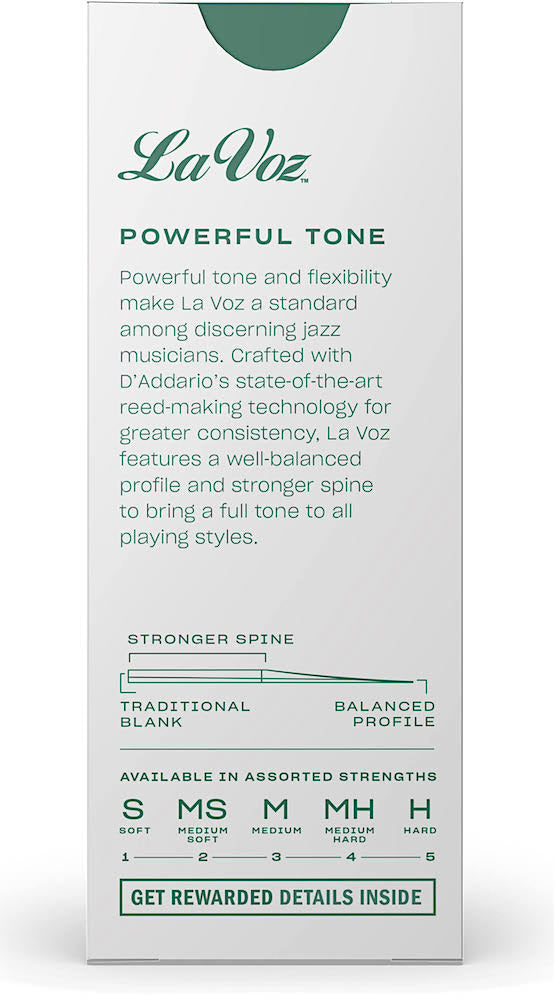 Powerful tone and flexibility make La Voz a standard among jazz musicians. Crafted by D'Addario's state of the art reed-making technology for ultimate consistency, featuring a well-balanced profile and stronger spine to bring a bold, full tone to all playing styles. Suitable for multiple musical styles. 5-Pack of unfiled Medium-Soft tenor saxophone reeds. Balanced profile and strong spine. Strength: #2 Medium-Soft. • MFSKU RKC05MS • UPC 046716585820