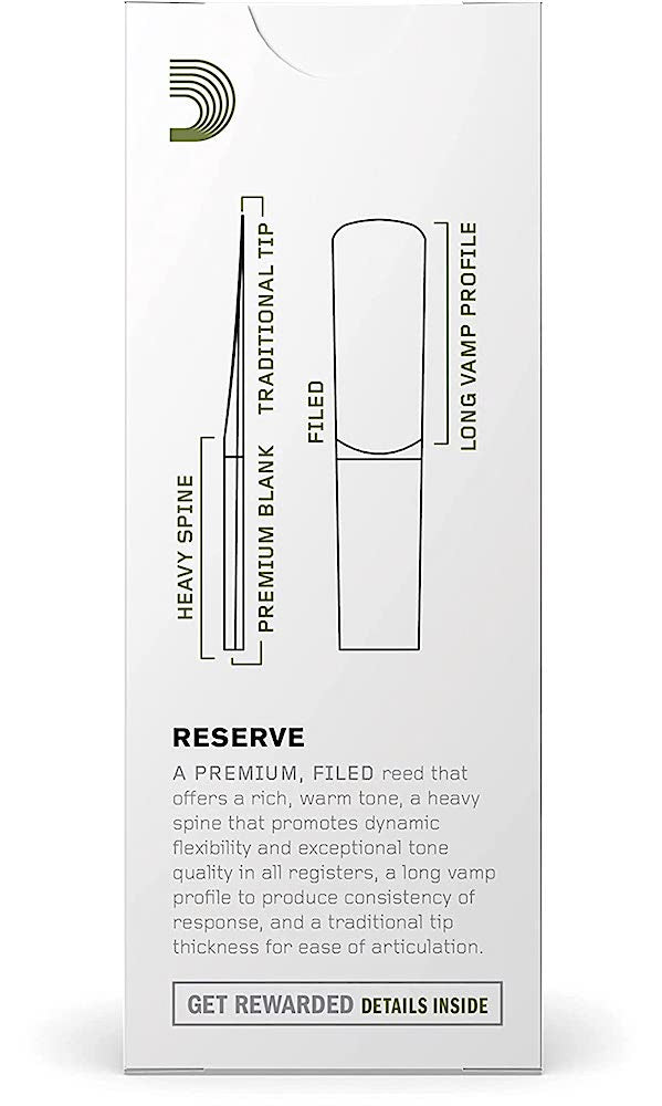 Tenor Sax #4.0 reeds. Rich Warmth and Dynamic Flexibility, that's what people are saying. In search of a warmer tone? Try D’Addario Reserve saxophone reeds. These cane reeds feature an extended vamp profile that imparts a richer warmth to the tone without limiting the player’s dynamic range. When tested, people loved the traditionally filed tip shape. It promotes easy articulation and response across a diverse selection of woodwind playing styles. Typically associated with classical and symphonic applications, D’Addario reports they’re equally well suited for chamber and experimental musicians. For warmth and exceptional response, look no further than D’Addario Reserve saxophone reeds. • MFSKU DKR0540 • UPC 046716583000