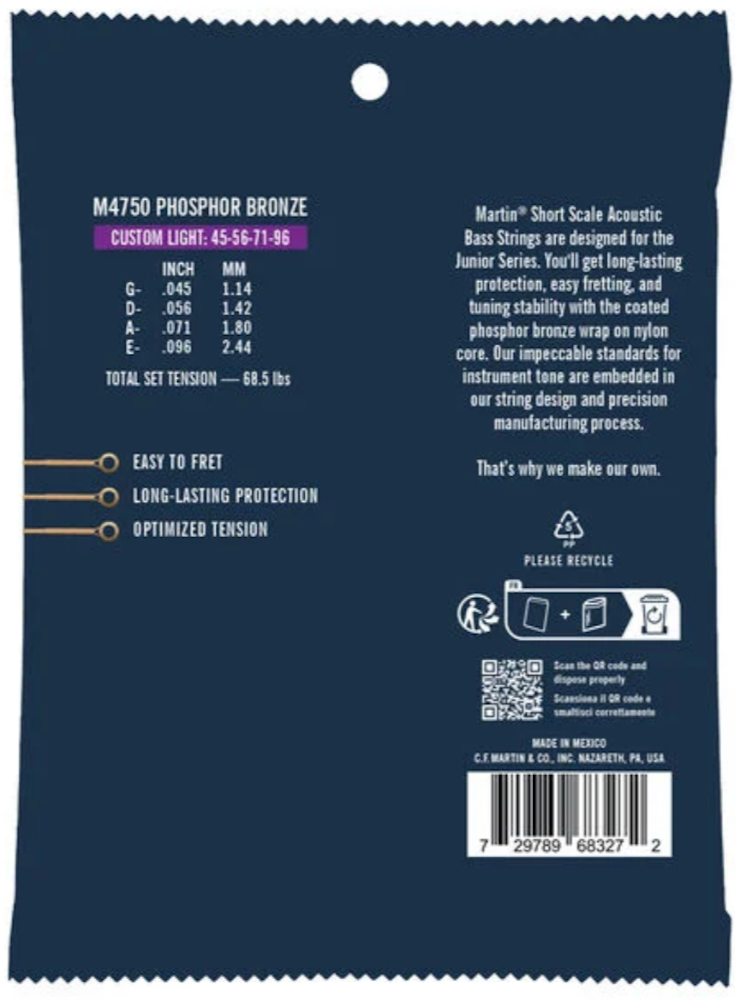 Martin Short Scale Acoustic Bass Strings are designed specifically for the Junior Series. Featuring phosphor bronze wrap on a nylon core for eased playability, full note projection, and tuning stability. Martin's impeccable standards for instrument tone are embedded in their string design and precision manufacturing process. • MFSKU M4750 • UPC 729789649704