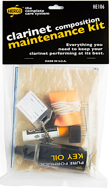 Herco HE105 Clarinet Maintenance Kit. The "Complete Care System" providing players their best choice for top quality instrument care accessories. These maintenance kits include everything needed for proper care of their instruments. The kit contain tools, guidelines and complete instructions for keeping instruments in peak performance condition. Used with composite clarinets. • MFSKU HE106 • UPC 710137006249