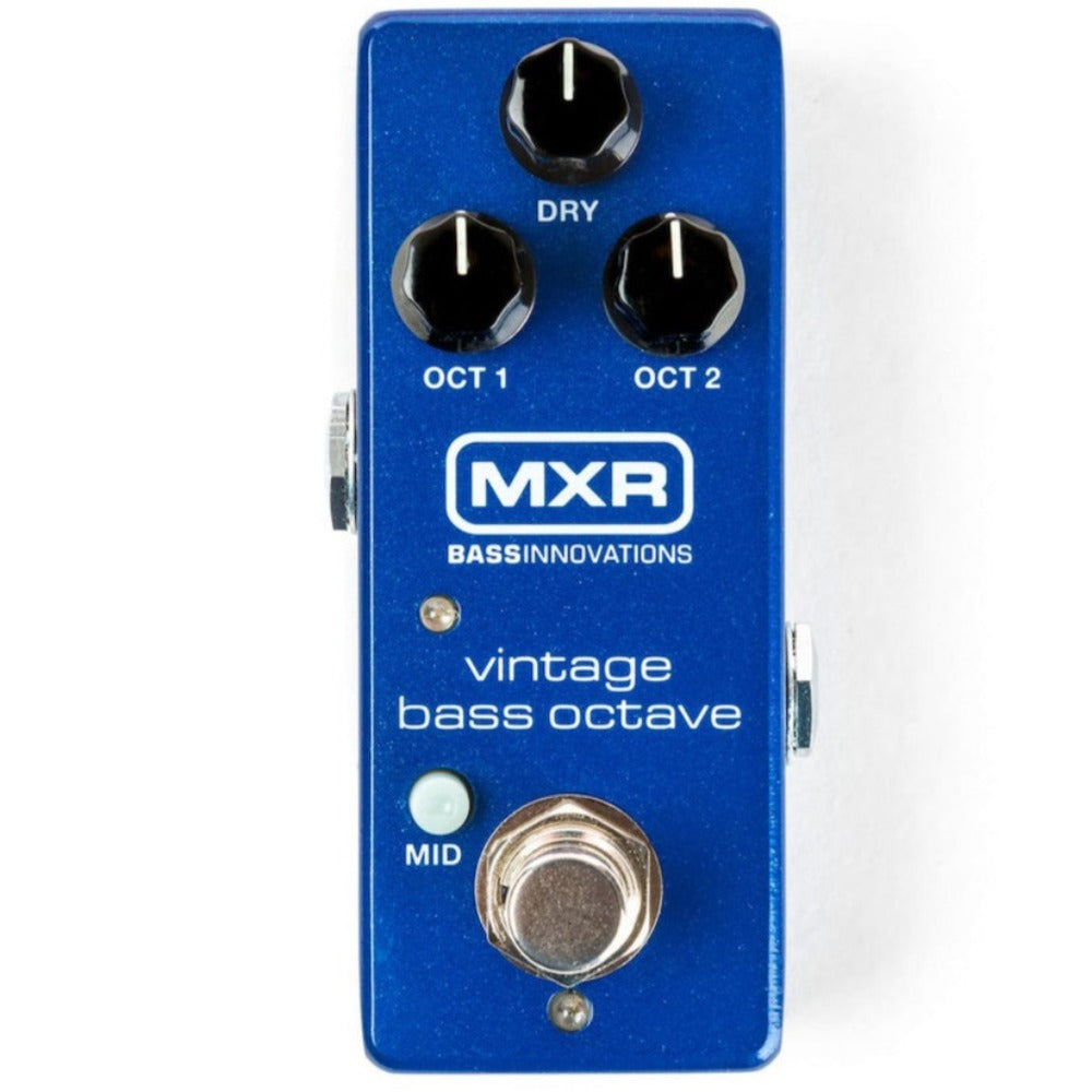 MXR M280 Vintage Bass Octave mini effects pedal in blue color with knobs and switches for sound control.