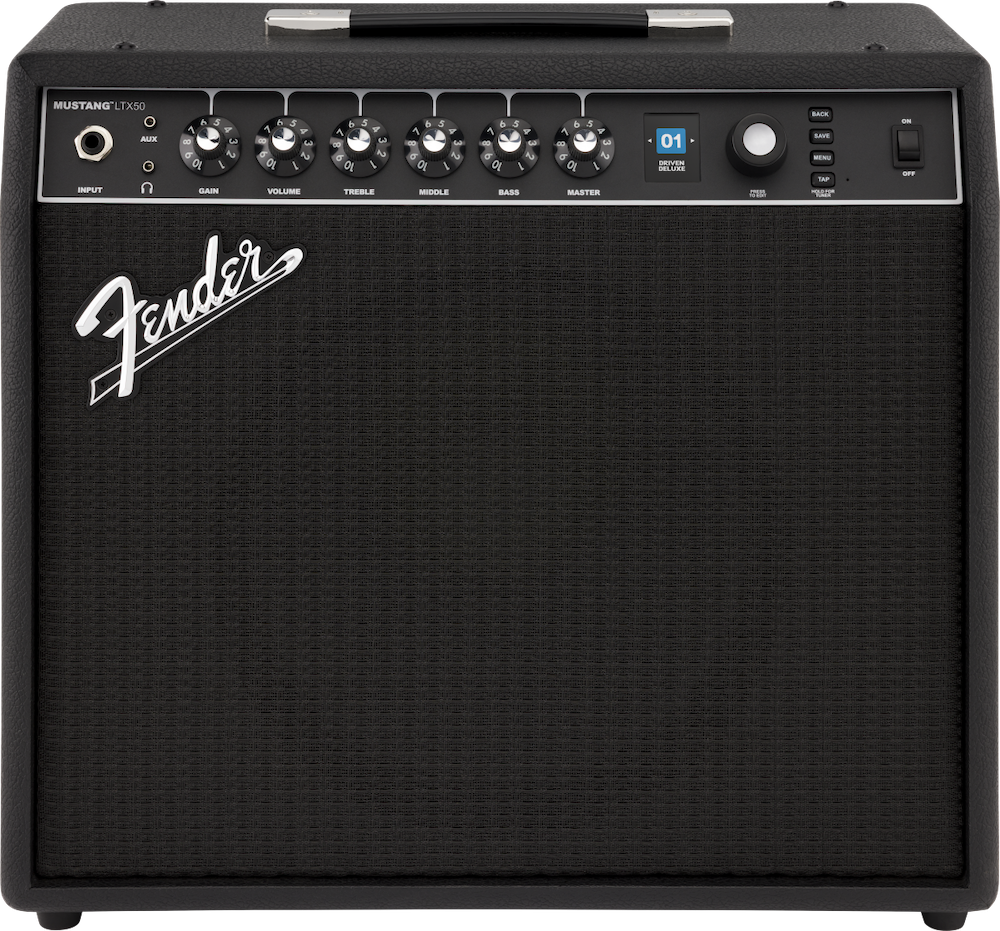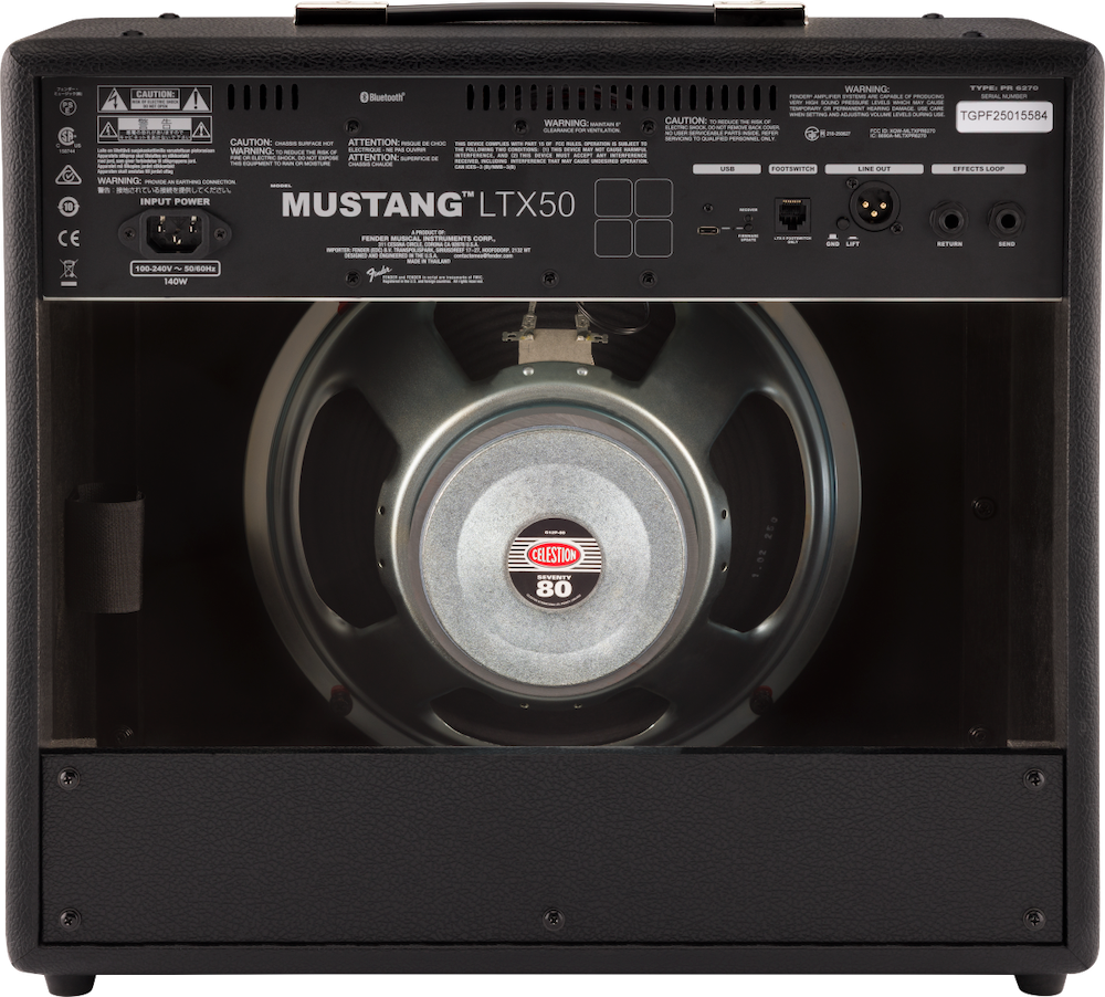 Blending high-tech features with classic Fender design, the Mustang LTX is perfect for any level of player. It features an intuitive user interface with 50 amp and effect models for any style of music, 100 preset slots, a configurable signal path and integrated color display with on-board tuner. • 50-watt combo amplifier • 12" Celestion G12P-80 speaker • 50 Amp and Effect Models • Integrated display with Chromatic Tuner • 100 Preset slots • Fender Tone app for iOS® and Android devices • Bluetooth audio streaming • Bi-directional USB recording • Stereo headphone output for silent practice • Optional gig-ready LTX-5 footswitch • MFSKU 2311700000 • UPC 717669705695