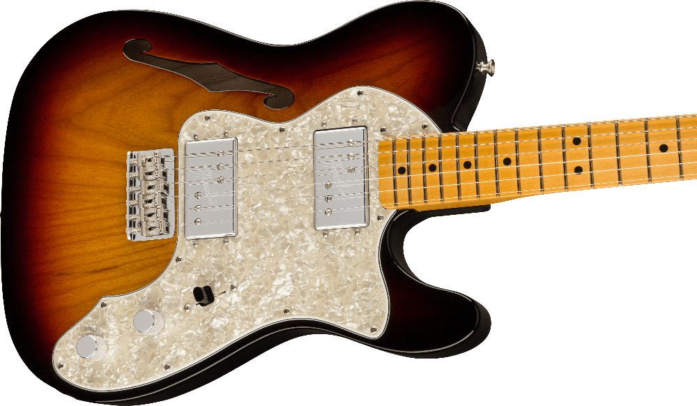 Featuring a "C"-shape hard rock maple neck, the American Vintage II 1972 Telecaster Thinline plays like a dream with a 7.25" radius fingerboard and vintage tall frets. To create authentic Wide-Range humbucking pickups, we resurrected CuNiFe magnets, an essential element in recreating the sonics of the originals. Characteristic of production in 1972, this Thinline is outfitted with a convenient "Bullet" style truss rod nut, three-bolt neck plate with Micro-Tilt mechanism, "F" stamped tuners, 6-saddle string-through body hardtail with bent steel saddles and offered in Aged Natural, 3-Color Sunburst, and Lake Placid Blue over a semi-hollow ash body. The instruments in the American Vintage II series are direct descendants of the original Fenders: designed for players with a fine appreciation for vintage Fender tone and feel and built with unmatched quality, down to the last screw. These are Fender electrics in their purest form: Fender American Vintage II, the stuff of legends. • MFSKU 0110392800 • UPC 885978840885