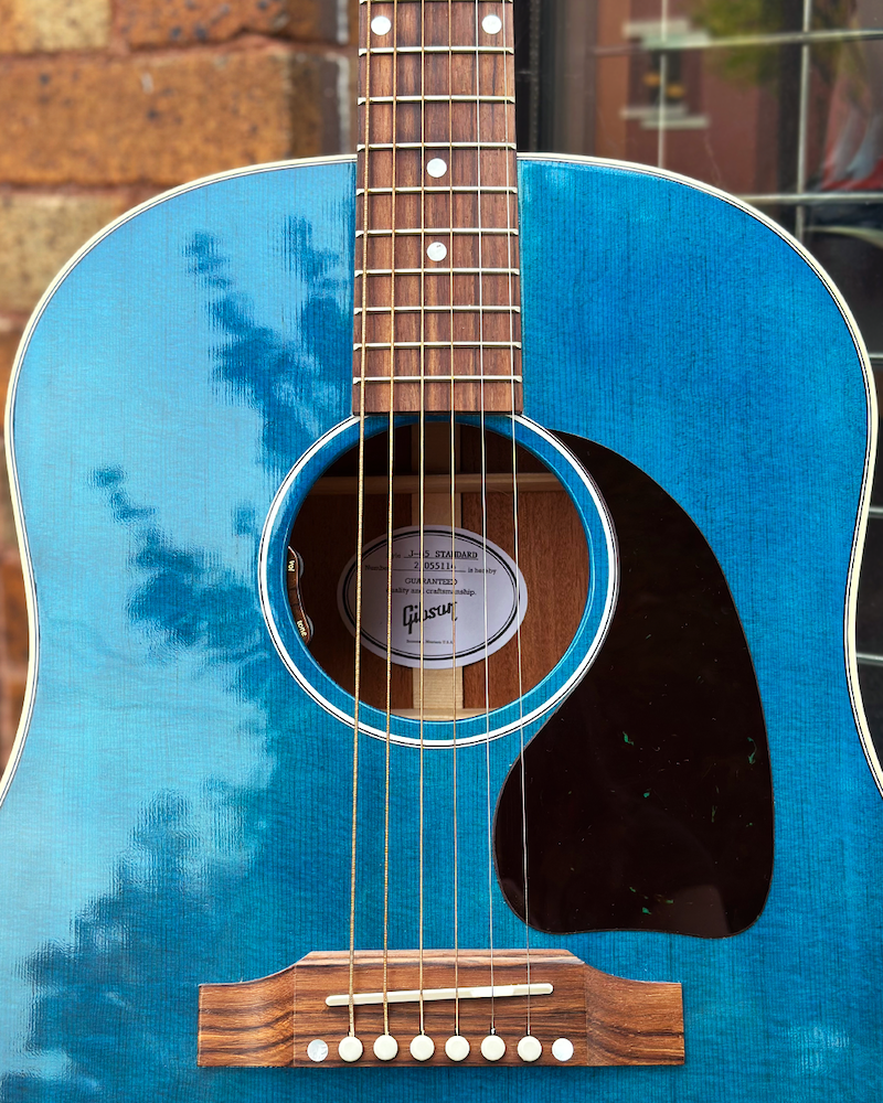 The Gibson J-45 Standard in Bluebonnet Gloss brings a vibrant and eye-catching finish to the classic dreadnought design. Crafted with a solid Sitka spruce top and mahogany back and sides, this guitar delivers the warm, balanced tone the J-45 is famous for, featuring rich lows, sparkling highs, and a full midrange.