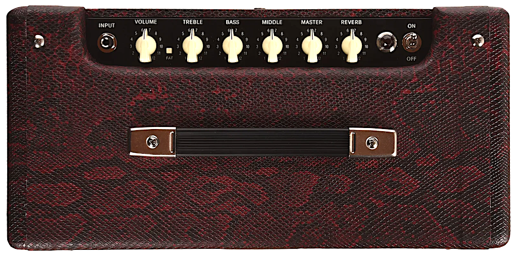 One of the most-beloved small combo amps in the world, the Blues Junior IV adds modified preamp circuitry, smoother-sounding spring reverb and improved aesthetics that any player is sure to appreciate. A 15-watt favorite in any setting, this amp is ideal for guitarists who need to hit the stage or studio at a moment’s notice with warm tone and versatile features. • Red Snakeskin/Black • Eminence Texas Heat speaker • MFSKU 2231500097 • UPC 885978779819