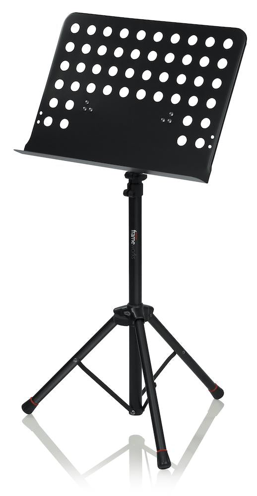 Compact, collapsible, lightweight sheet music stand with tripod base design. 18.75" perforated sheet music/portfolio tray with a maximum height of 45". • MFSKU GFW-MUS-0500 • UPC 716408543284
