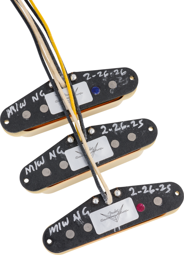 Fender Custom Shop Dual-Mag II Stratocaster pickups produce well-balanced tone with shimmering, clear highs and rich lows courtesy of a mix of alnico magnets. Featuring unbeveled alnico 5 magnets from the low E through G and hand-beveled alnico 2 magnets for the B and high E. Additionally, each pickup is wrapped with copper shielding tape to reduce noise.