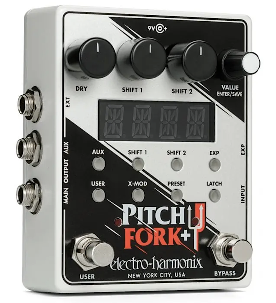 The EHX Pitch Fork+ features two independent pitch shifting engines with full control over each. Both will transpose your pitch up or down over a +/- three octave range and detune +/-99 cents. With rock solid tracking, an organic, musical tone and extensive control, it’s your ultimate harmonizer. • MFSKU FORK+ • UPC 683274012216