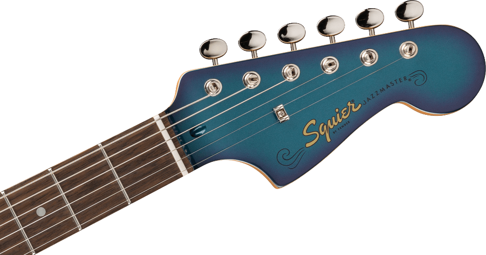 Close-up of a blue electric guitar headstock with 'Squier' branding on a green background