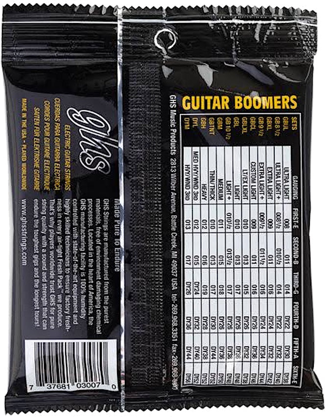 GHS Boomers are the longstanding and original "Power Strings". Using GHS' Dynamite Alloy these strings pack a bold, POWERful, bright punch while being flexible, soft, and smooth to play thanks to the round core. Halfway between an .010 set and .011 set. Perfect for the player that needs a bit more than the regular lights can offer. • MFSKU GB10.5 • UPC 737681030070