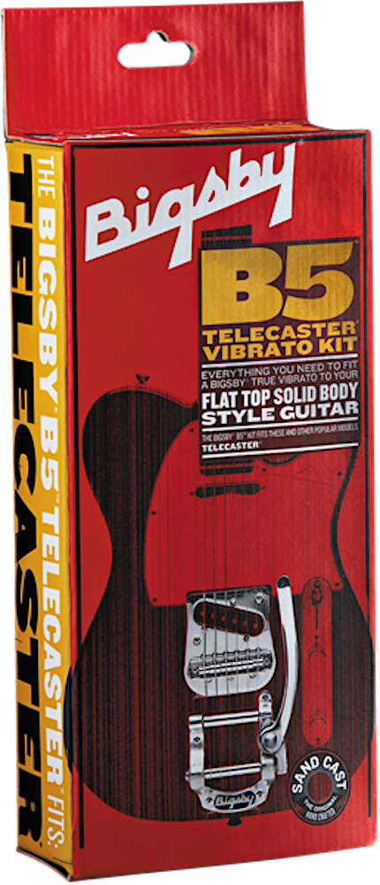 Sometimes referred as the Bigsby "horseshoe" is designed for flat top solid body guitars and features a tension bar to increase the break angle over the bridge. Attaching via four screws to a guitar's top, the B5 is extremely versatile. The B5 Telecaster Modification Kit includes a chrome bridge and a bridge pickup plate. Fits most Telesacter guitars. • MFSKU 0868013002 • UPC 717669953119