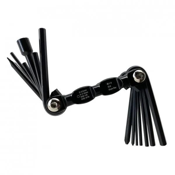 The AHEAD Compact Drum Multi-Tool Includes: Drum Key, Hex Keys in 2mm, 2.5mm, 3mm, 4mm, 5mm, 3/32in., 1/8in., 5/32in., 3/16in., 5mm Slotted Screwdriver and two Philips Screwdrivers.