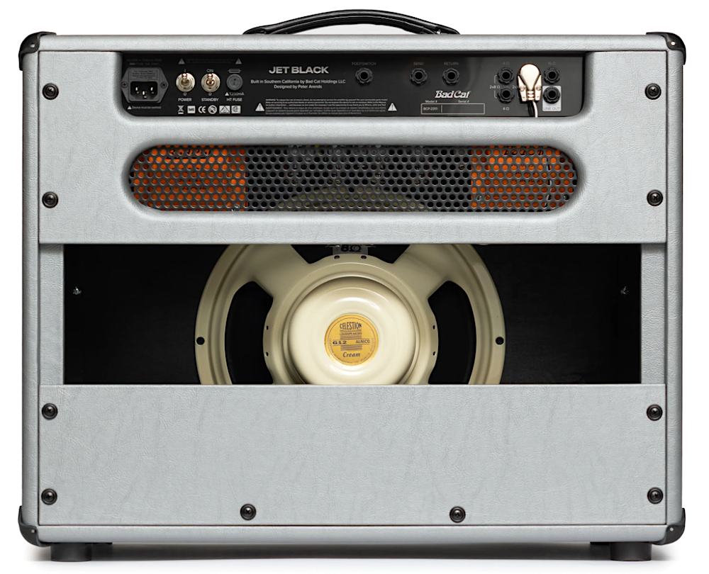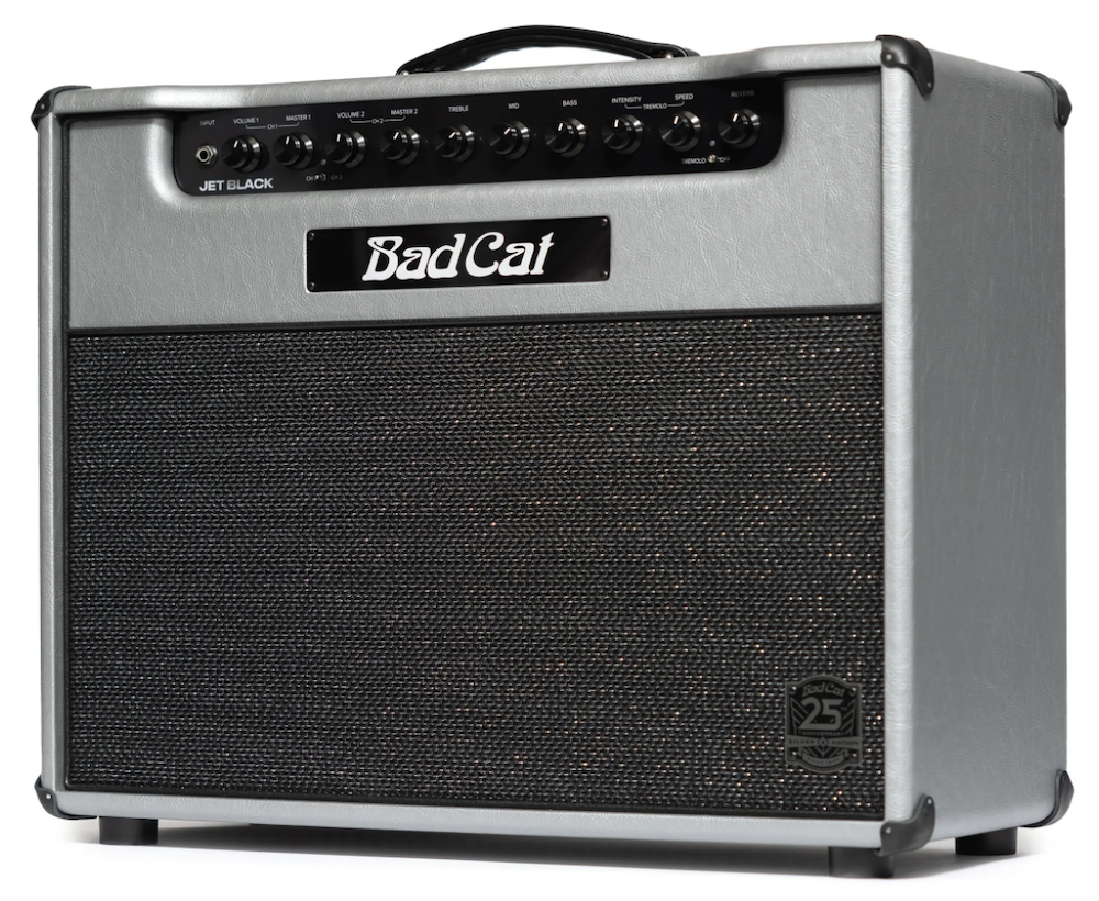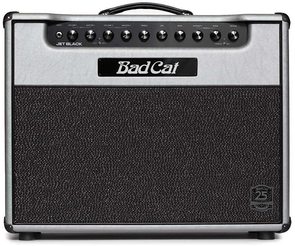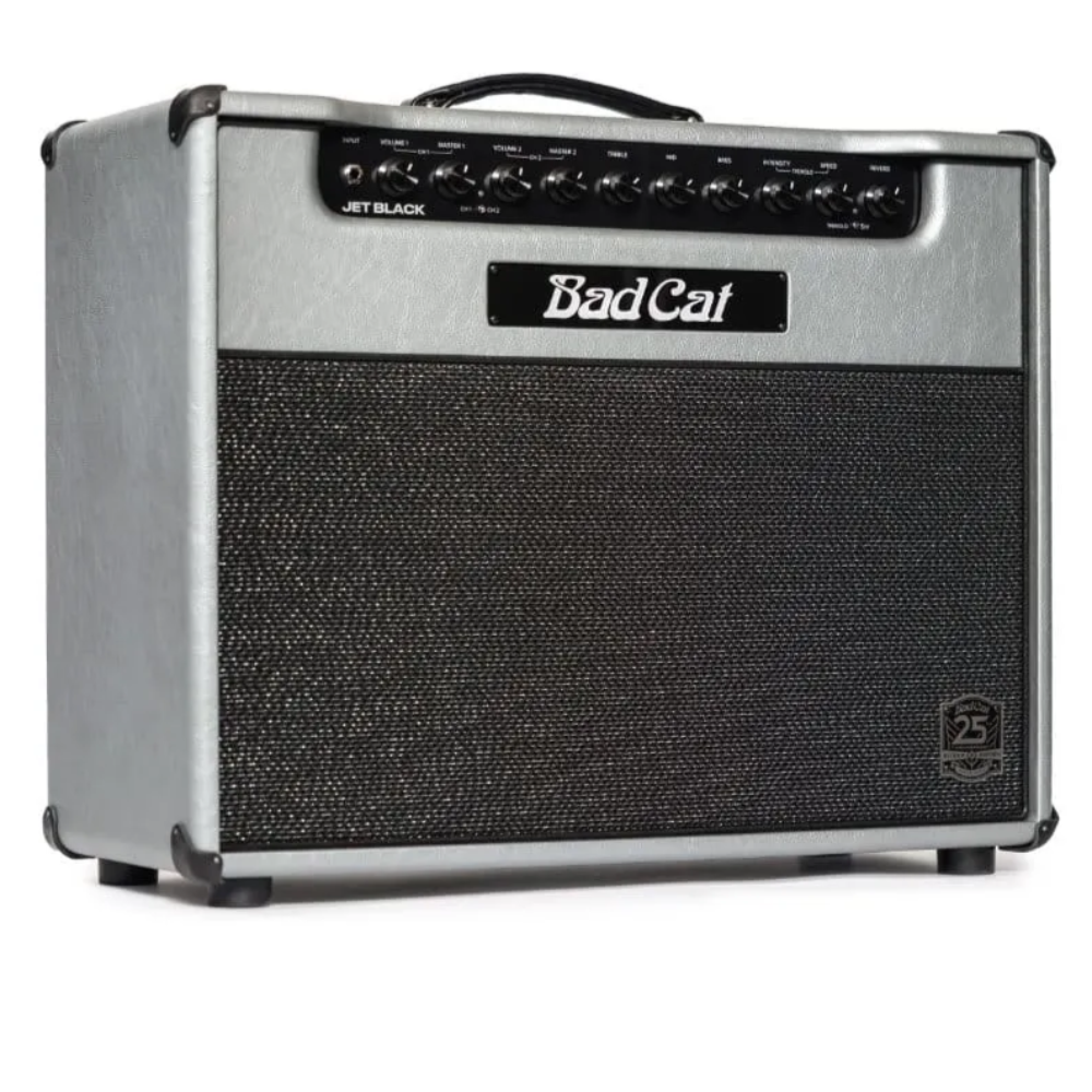 Celebrate 25 years of Bad Cat with the limited-edition Jet Black 25th Anniversary, presented in a stunning silver anniversary aesthetic. The stunning silver tolex is paired with upgraded etched aluminum control panels that enhance the visual and tactile experience. The distinctive 25th-anniversary grille badge proudly marks this special edition, making it a collector’s dream. Enhancing the sonic experience, the Jet Black 25th Anniversary is equipped with an upgraded Celestion Alnico Cream speaker, delivering unparalleled tonal quality and responsiveness. This ultra-premium speaker adds a layer of richness to your sound, ensuring that every note is delivered with precision and clarity. In stock now at Twin Town Guitars in Minneapolis! • MFSKU BCP-2317-K112-120V-25TH • UPC 850042469460