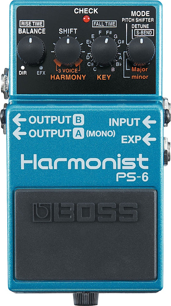 Four intelligent pitch-shift effects and three-voice harmony. Harmony, Pitch Shifter, Detune, and Super Bend modes. Meet the new BOSS harmonist, with four intelligent pitch-shift effects and three-voice harmony in one convenient unit. Among the effect modes are Harmony, Pitch Shifter, and Detune, plus the all-new Super Bend for authentic pedal-bending effects and wild three- and four-octave pitch sweeps. You can even control pitch with an optional expression pedal. The harmony function is fast and simple to use, and supports a variety of interval patterns. It’s easy to create rich, three-voice harmony: choose a major or minor key, and set SHIFT to 3-VOICE—that’s it! The PS-6 Harmonist is an unbeatable combination of superior sound quality, ease of use, and powerful pitch effects, all under one hood. • MFSKU PS-6 • UPC 761294413296