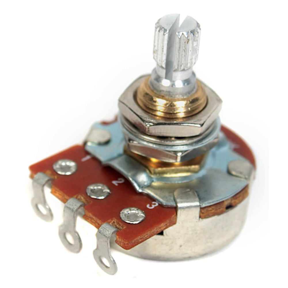 Bourns 500K split shaft audio taper potentiometers. Some features of this pot are: 500K Ohms/15% Tolerance Audio Taper. Solid brass 3/4" bushing Split, coarse 18-tooth, knurled, .236" diameter shaft Each pot comes with hardware - nut & dress washer Requires 3/8" diameter mounting hole. • MFSKU PDB241-GTR01 • UPC 691852991785