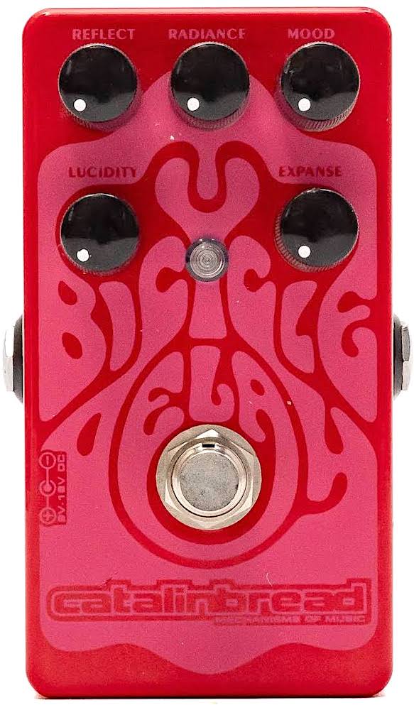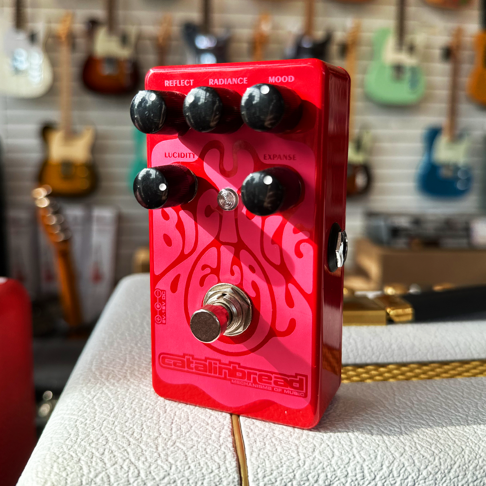 Catalinbread Bicycle Delay. The pedal adds pitch shifting up or pitch shifting down on the delays. There is a really awesome high off tone knob that allows you to take off some of the harsh repeats. I find the pitch down repeats more musical than the pitch up.The way this pedal behaves is metaphoric to how I’ve been looking at life. Approach it from a negative perspective, go ahead, make it spiral downward. There is beauty in it, like there is enjoyment in picking at a scab. It’ll take you to darker musical places fitting for the vampires at night. It all depends on your mood. Bring it up, it wants to take off. Happiness in a madhouse. The most difficult and interesting stuff begins to happen when you keep it balanced. Edges of notes brighten radiantly to prominence, like the flora and fauna do when I walk Clemma in the early morning sun. • MFSKU Bicycle Delay • UPC 853710004338