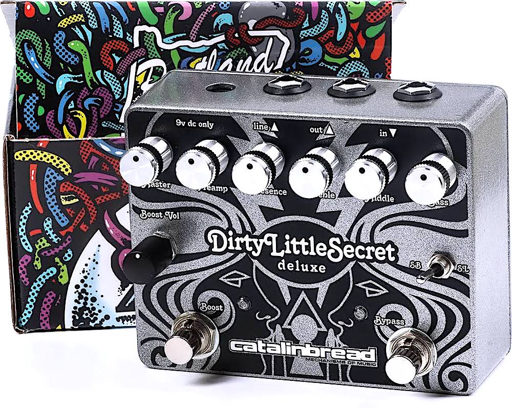 Behold! The Dirty Little Secret Deluxe from Catalinbread represents the next logical step in Marshall Plexi emulation, reaching beyond the preamp circuit and adding the rest of the amp for an extremely authentic take on everything inside that chassis. The original DLS circuit has been tweaked and upgraded throughout, now featuring a phase inverter, power amp sim and output transformer as well as some new features and the most requested modifications for the original. The ultimate Marshall Plexi emulation and fully-customizable amp-in-a-box experience. In stock now at Twin Town Guitars. • MFSKU DIRTY LITTLE SECRET DELUXE • UPC 853710004536