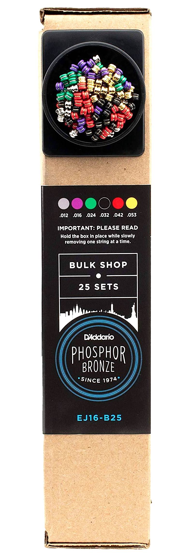 Got lotsa acoustics? Since D'Addario introduced Phosphor Bronze guitar strings in 1974, they have been synonymous with warm and well-balanced acoustic tone. EJ16 is D'Addario's most popular set of light gauge strings for acoustic guitar, and this bulk pack has 25 sets. • MFSKU EJ16-B25 • UPC 019954944698