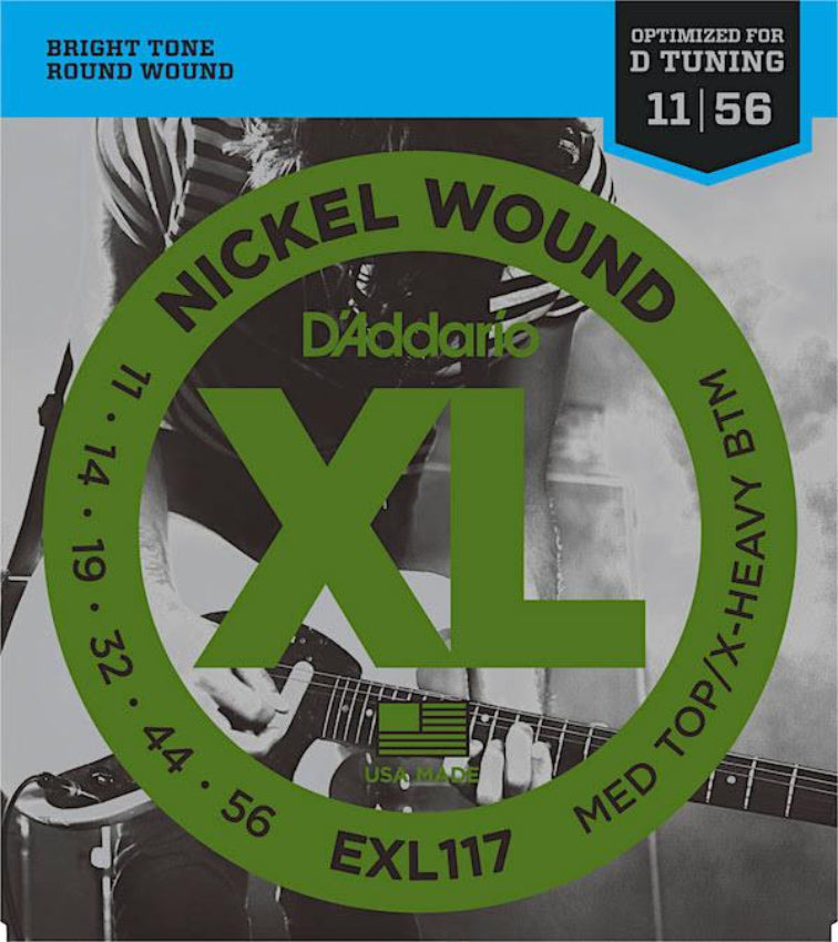 EXL117 is an extreme hybrid set, optimally designed for tuning guitars down a whole step to D, while maintaining a comfortable playing tension like that of a "light" gauge set. • MFSKU EXL117 • UPC 019954962531