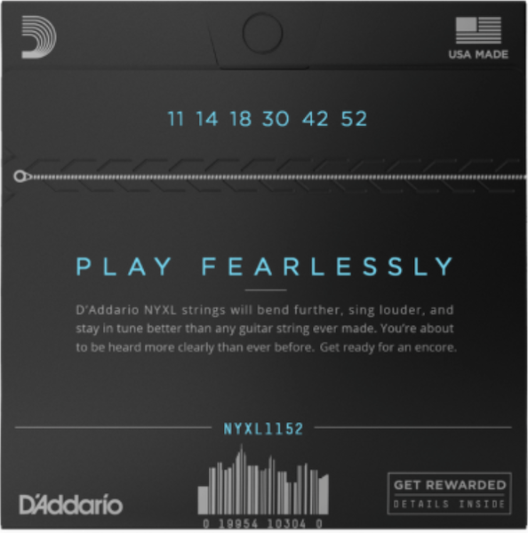 A hybrid set giving the strings moderate flexibility on the high strings with booming, tight low end. D'Addario NYXL guitar strings will bend farther, sing louder, and stay in tune better than any string you ve played before. Envisioned, perfected, and manufactured by D Addario in New York, this newly engineered, break-resistant, high-carbon steel core and plain steel alloy delivers a whole new level of freedom, confidence, and power. • MFSKU NYXL1152 • UPC 019954103040