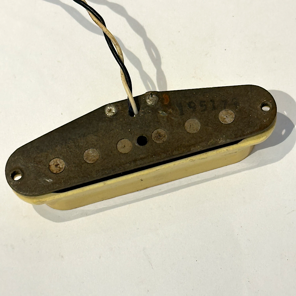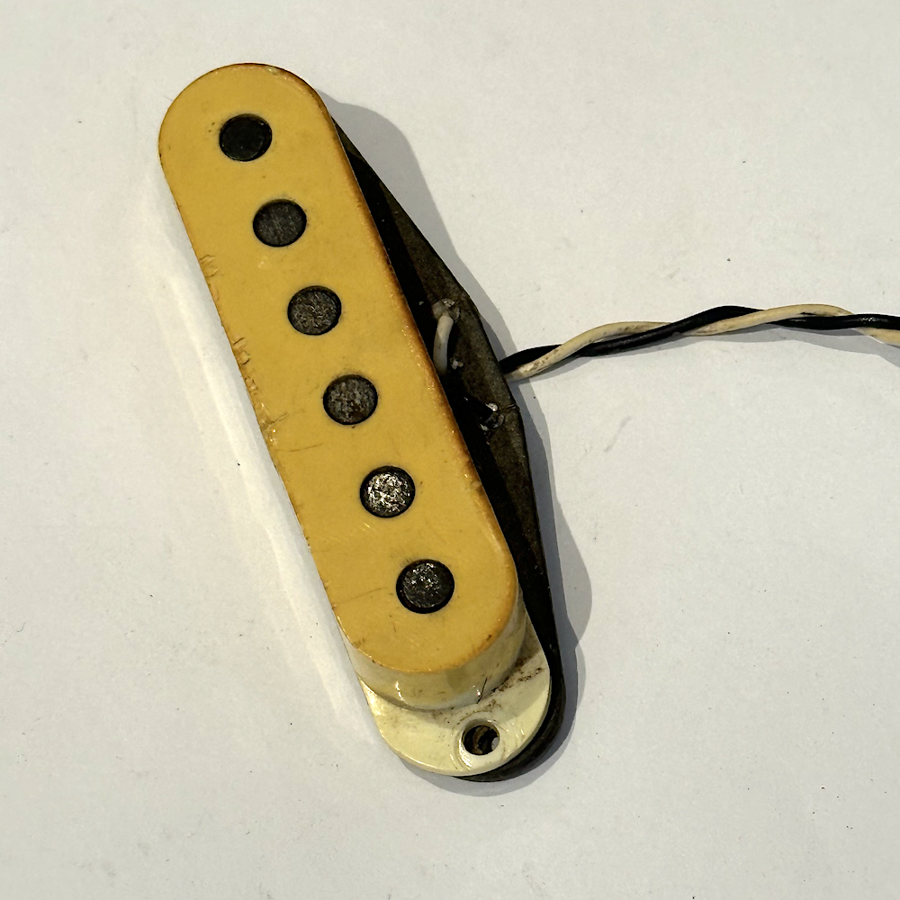 Flat pole single coil Fender from the 1970s. Dark blue-purple enamel wiring make this p'up measure out at 5.65 Ohms. Comes with what must have been a once-upon-a-time white pickup cover.