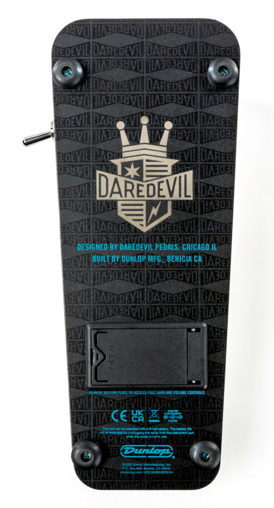 The Cry Baby Daredevil Fuzz Wah fuses the sweet and expressive voice of a modded Cry Baby Wah with a gnarly custom fuzz circuit for a full palette of raw and aggressive tones. This pedal’s origin lies in Daredevil proprietor and builder Johnny Wator’s love for classic vintage circuits and the desire to create bold new sounds. Inspired by his personal wah-wielding guitar heroes, Johnny fine-tuned this circuit over several years, building them for friends and bandmates, before bringing it to Dunlop for consideration as a new addition to the lineup. The Cry Baby Daredevil Fuzz Wah is the resulting collaboration, and in true Daredevil fashion, it’s straight-forward and downright dirty. The only external control is a heavy-duty baseball bat switch to toggle the fuzz on and off. Removing the bottom plate reveals two more controls: one to set the pedal’s output when the fuzz is engaged and another to dial in your preferred level of fuzz nastiness. For instant lead tone, boost both the output and gain—in one step, you’re ready to rip. This fuzz wah is packed with killer old school tones and enough power to blow the whole dang room to pieces. • MFSKU DD95FW • UPC 710137131590