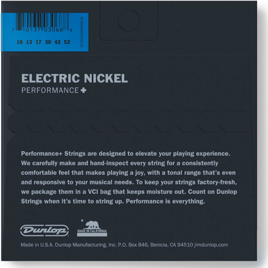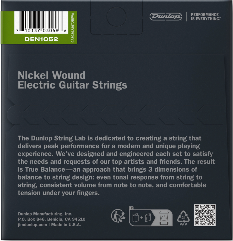 These nickel wound strings deliver crisp highs, aggressive mids, and a focused low end for dynamic lead work and chords that ring out clearly whether clean or heavily distorted. Gauges: 10 - 13 - 17 - 30 - 42 - 52 Made in the USA. • MFSKU DEN1052 • UPC 710137030688