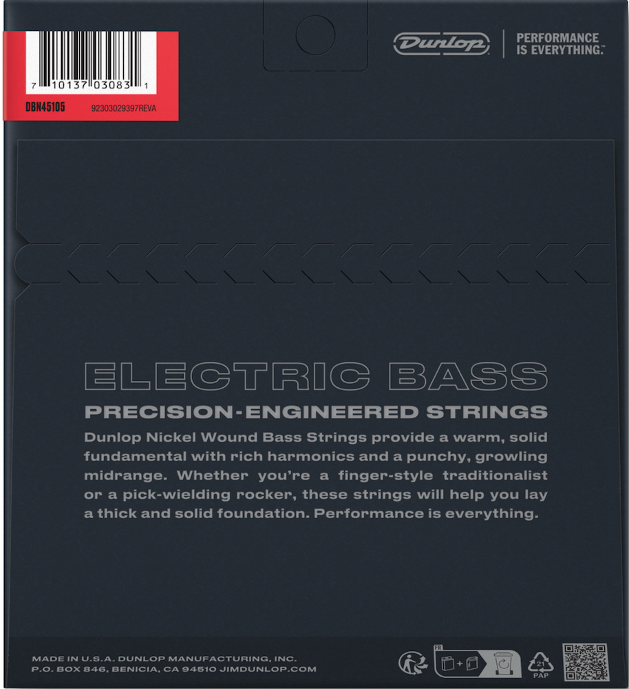 These nickel wound bass strings provide a warm, solid fundamental with rich harmonics and a punchy midrange. Bass - Nickel - Long Scale - 4-String Set. Bass players demand consistency, durability, and versatility from their strings. Dunlop delivers. Dunlop Bass Strings offer traditionalists, slappers, and pick-wielding rockers cutting midrange, wide bottom end, and a growl that will cut through any band. Carefully selected core-to-wrap ratios yield low tension strings with an extremely long life, and minimal break-in time. Each set is exceptionally well balanced string-to-string, and provides an amazing amount of dynamic range. Electric Bass - Nickel Wound - Medium - 4-String Set. Gauges: 45, 65, 85, 105 • MFSKU DBN45105 • UPC 710137030831
