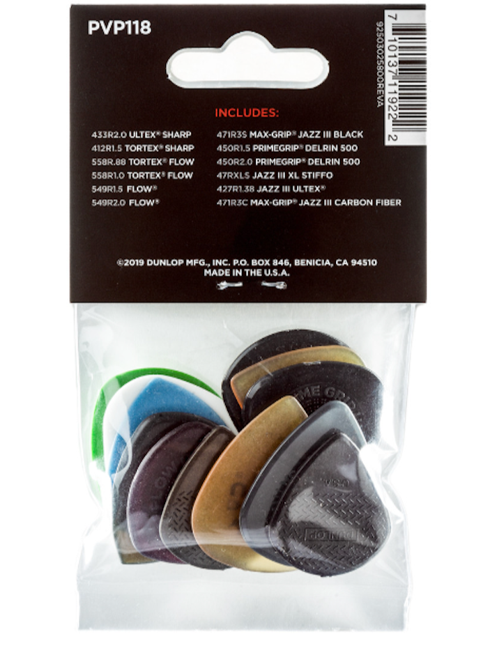 The Shred Pick Variety Pack features a carefully curated selection of picks that are designed to let you show your advanced technique. PVP118 Shred Variety Includes: 433R2.0 Ultex Sharp, 412R1.5 Tortex Sharp, 558R.88 Tortex Flow, 558R1.0 Tortex Flow, 549R1.5 Flow, 549R2.0 Flow, 471R35 Max-Grip Jazz III Black, 450R1.5 Primegrip Delrin 500, 450R2.0 Primegrip Delrin 500, 47RXLS Jazz III XL Stiffo, 427R1.38 Jazz III Ultex, 471R3C Max-Grip Jazz III Carbon Fiber • MFSKU PVP118 • UPC 710137119222