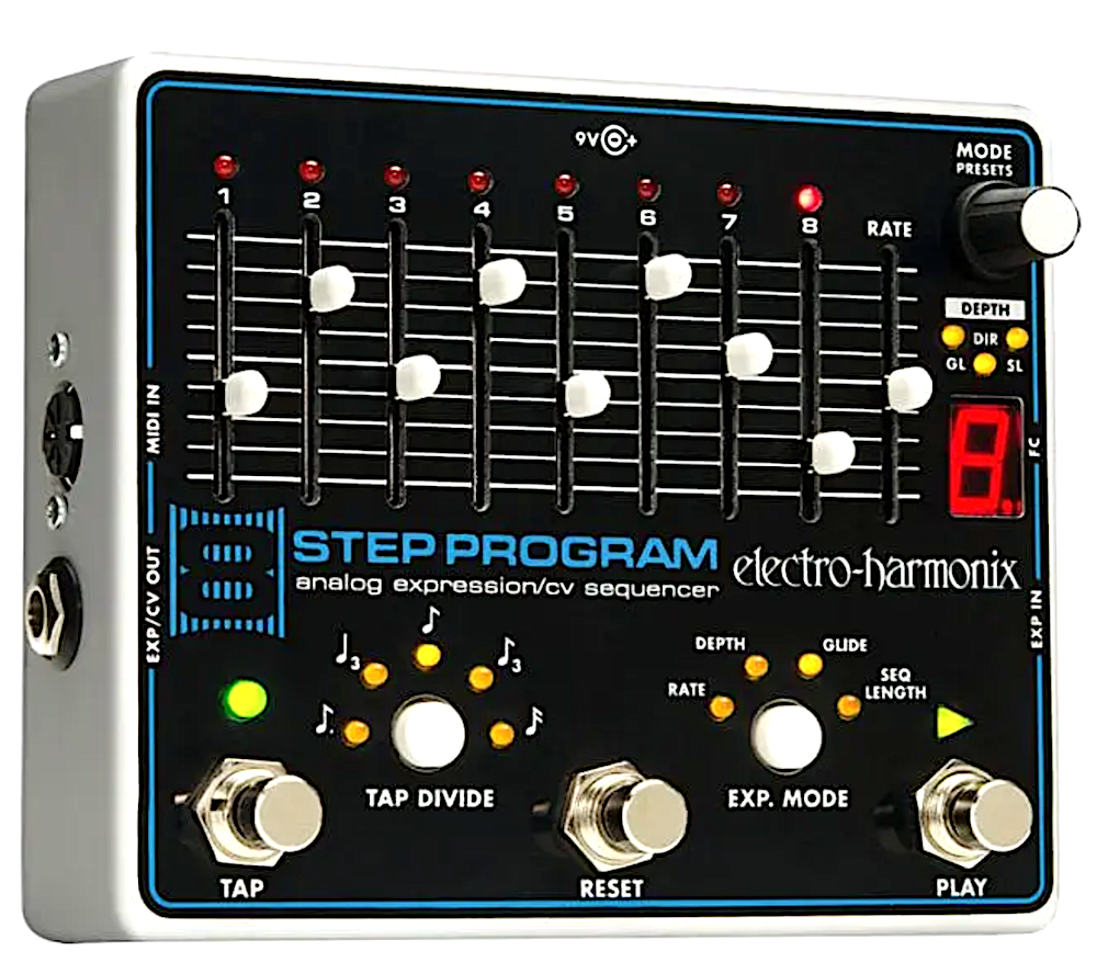 This analog sequencer connects to another device and delivers sequencer control over parameters that respond to expression pedals or CV generators like oscillators, filters, delay parameters you name it. Set your tempo with the Rate slider or Tap Tempo footswitch, or sync to a drum machine or DAW via MIDI clock. Six Tap Tempo Divide modes provide rhythmic diversity. This thing is a tweaker’s delight! You can add the optional 8 Step Program Foot Controller expands that to 100 presets! • MFSKU 8STEP • UPC 683274011363