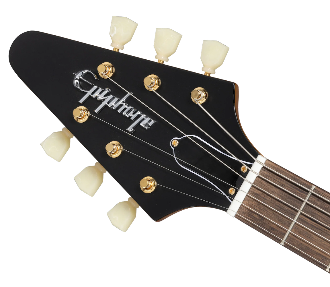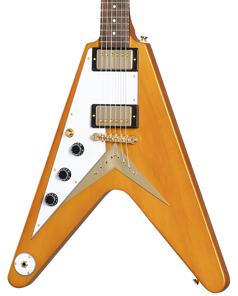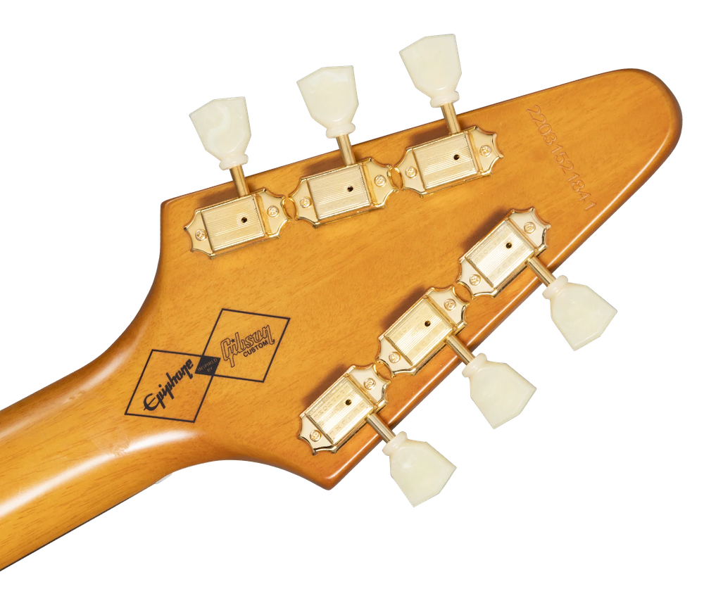 Made in partnership with the Gibson Custom Shop - Inspired by Gibson Custom Shop, the Limited Edition 1958 Flying V is Epiphone’s impressive recreation of one of the most famous and valuable vintage guitars ever made. It brings authentic 1958 Flying V details to guitarists everywhere at a breakthrough price. Like the ultra-rare original Gibson models from 1958, it features a Korina body and a Korina neck with a long neck tenon and a 1958 Flying V neck profile. It is also equipped with an Indian laurel fretboard and gold hardware. The top-notch electronics with Gibson Burstbucker 2 and Burstbucker 3 pickups wired to individual volume controls and a master tone control with CTS pots and a Mallory caps, along with a Switchcraft 3-way pickup selector switch and 1/4” output jack. An Epiphone x Gibson Custom logo on the back of the headstock is displayed, and a hardshell case is also included. Rock it southpaw! • MFSKU IGCKFVWANAGH1L • UPC 711106091662