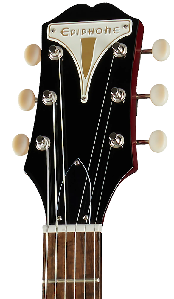 The Crestwood first appeared in 1958 and it was renamed Crestwood Custom in 1959; it was Epiphone's first two-pickup solid-body electric guitar design. The new Epiphone Crestwood Custom returns to its roots with features that harken back to the early models including a symmetrical double-cutaway mahogany body with two Epiphone PRO Mini Humbucker pickups, three on a side reduced sized Kalamazoo headstock with Epiphone Bikini badge and ivory button Epiphone Deluxe tuning machines, and a clear butterfly pickguard with white center stripe and foil E logo. The Crestwood Custom comes equipped with a glued-in mahogany neck with a medium C profile, Indian laurel fretboard with 12" radius, 22 medium jumbo frets and Epiphone oval inlays, 2 volume and 2 tone controls with CTS potentiometers, and an Epiphone LockTone Tune-O-Matic bridge with Graph Tech TUSQ saddles and Tremotone vibrato tailpiece. • MFSKU EOCCCHNH1 • UPC 711106046068