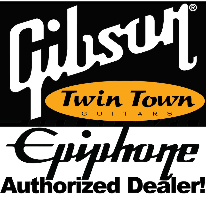Gibson and Epiphone logos with 'Twin Town Guitars' text on a black background