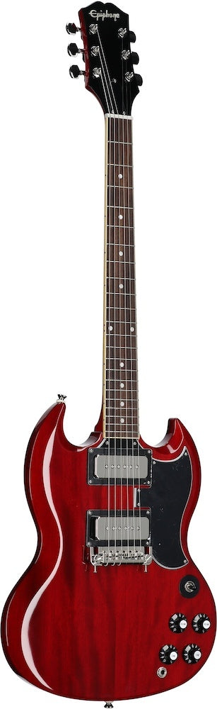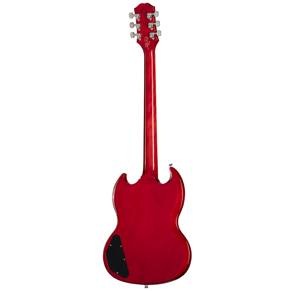 Tony Iommi's iconic riffs, heavy tones, and massively influential albums created the blueprint for heavy metal and many other genres to follow. His career, like the man himself, is universally loved and revered. And while his innovative tuning and playing styles were a major part of his monstrous tones, a heavily modified 1964 Gibson SG™ was at the center of it all. Epiphone is proud to release a guitar based on the iconic original that launched countless heavy riffs. The Epiphone Tony Iommi SG Special features a two-piece mahogany body, a bound one piece mahogany neck with a rounded profile, an Indian laurel fretboard with 22 frets, a Graph Tech® nut, Grover® Rotomatic® tuners with contemporary style buttons, and chrome-covered Epiphone PRO P-90 pickups that are wired to CTS® potentiometers and Orange Drop® capacitors. A static cling reproduction of Tony's "Monkey" sticker is in the included hardshell case.
