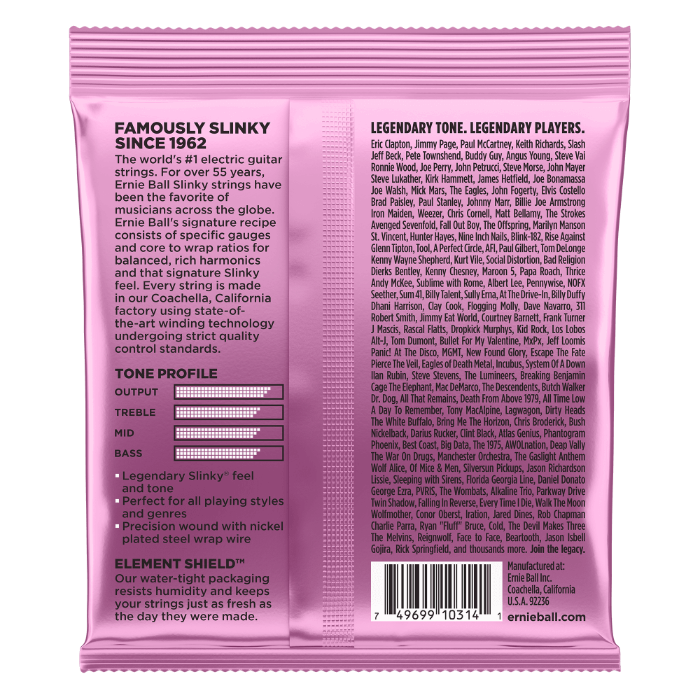 Ernie Ball Nickel Wound Electric Guitar Strings are made from nickel plated steel wire wrapped around tin plated hex shaped steel core wire. The plain strings are made of specially tempered tin plated high carbon steel producing a well balanced tone for your guitar. Gauges .0105, .0135, .0175, .028, .038, .048 • MFSKU P02213 • UPC 749699103141