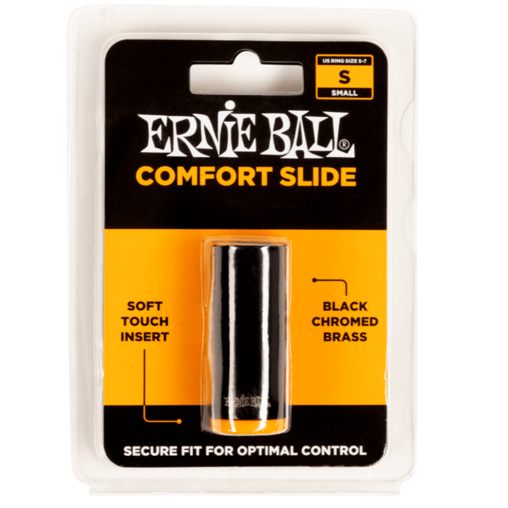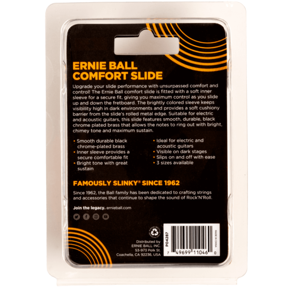 The Ernie Ball comfort slide is fitted with a soft inner sleeve for a secure fit, giving you maximum control as you slide up and down the fretboard. The brightly colored sleeve keeps visibility high in dark environments and provides a soft cushiony barrier from the slides’ rolled metal edge. Suitable for electric and acoustic guitars, this slide features smooth, durable, black chrome plated brass that allows the notes to ring out with a bright, chimey tone and maximum sustain. • MFSKU P04287 • UPC 749699110460