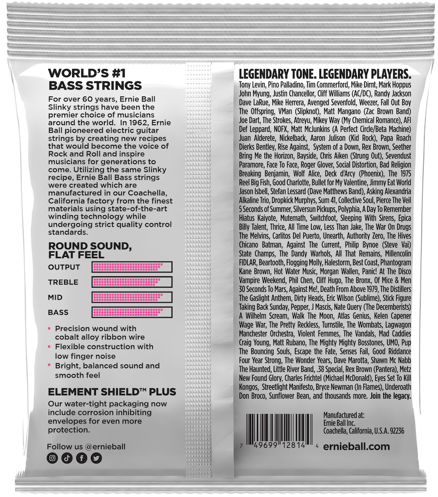 Ernie Ball Slinky Flatwound Bass Strings combine the smooth feel of traditional flats and the power of Cobalt. Featuring a SuperBright Cobalt ribbon wrap, Cobalt underwraps and optimal hex-core to wrap ratio, the new Flatwound Bass strings are the first flat that actually feels like a flat and sounds like a round. Gauges .045, .065, .080, .100 • MFSKU P02814 • UPC 749699128144