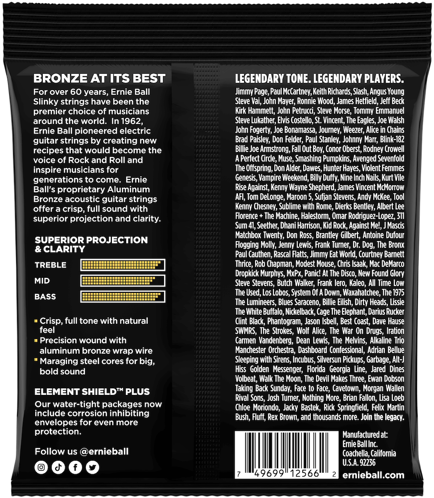 Ernie Ball Aluminum Bronze Acoustic Guitar Strings feature more projection and clarity than traditional bronze strings, while also providing improved corrosion resistance. Aluminum Bronze Acoustic strings are made with Ernie Ball Maraging Steel hex cores and Aluminum Bronze wrap wire which provide more pronounced lows coupled with crisp brilliant highs. Made from a blend of copper and aluminum specifically tailored for acoustic guitar strings. Medium Light gauge .012, .016, .024, .032, .044, .054 • MFSKU P02566 • UPC 749699125662
