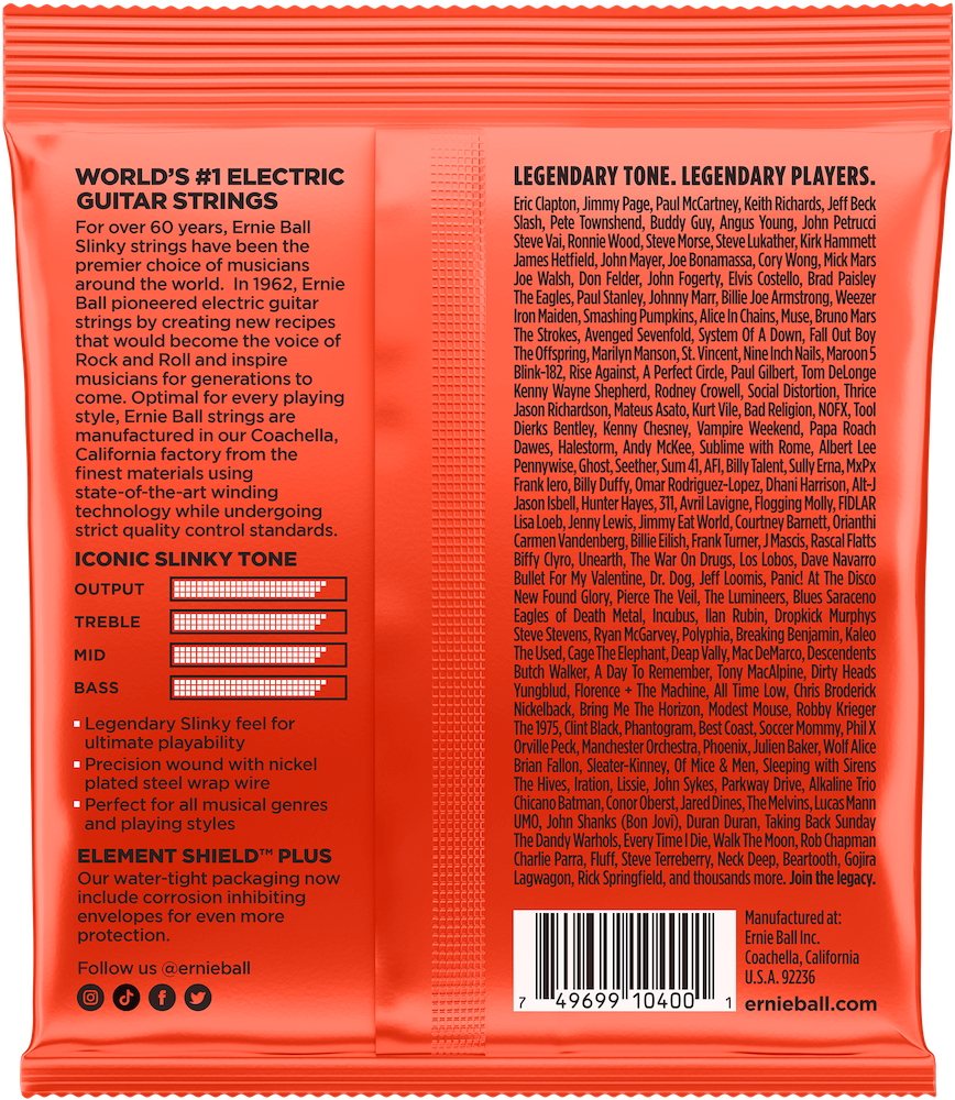 Skinny Top Heavy Bottom 7-String Slinky’s extends the popular 6-string gauge combination for 7-string players. This set is the ultimate mixture for lead players who love to bend for solo work coupled with a heavy bottom end for rhythm and chords. Gauges .010, .013, .017, .030, .042, .052, .062 • MFSKU P02615 • UPC 749699104001