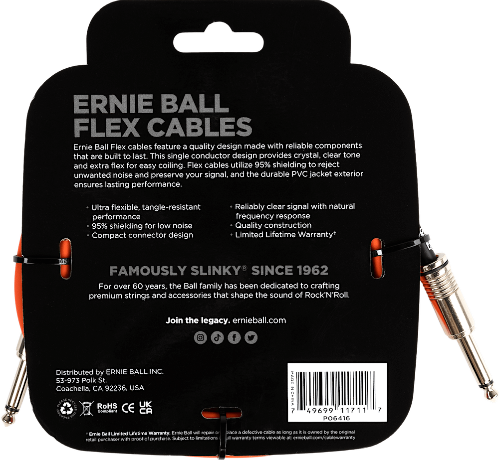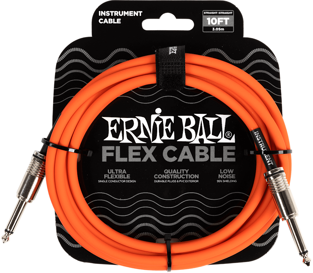 Neon orange! Ernie Ball Flex cables feature a quality design made with reliable components that are built to last. This single conductor design provides crystal, clear tone, and extra flex for easy coiling. Flex cables utilize 95% shielding to reject unwanted noise and preserve your signal, and the durable PVC jacket exterior ensures lasting performance. • MFSKU P06416 • UPC 749699117117