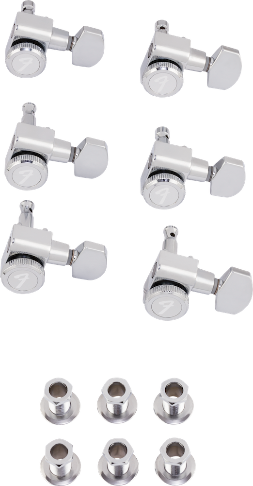 Set of six locking tuners designed to fit most modern-style Fender electric guitars with dual-pin mounting configuration. Tall post tuners are used for the wound strings and shorter post tuners are used for the plain strings. Staggered tuners increase the break angle over the nut and improve tuning stability. • MFSKU 0990818100 • UPC 717669511357