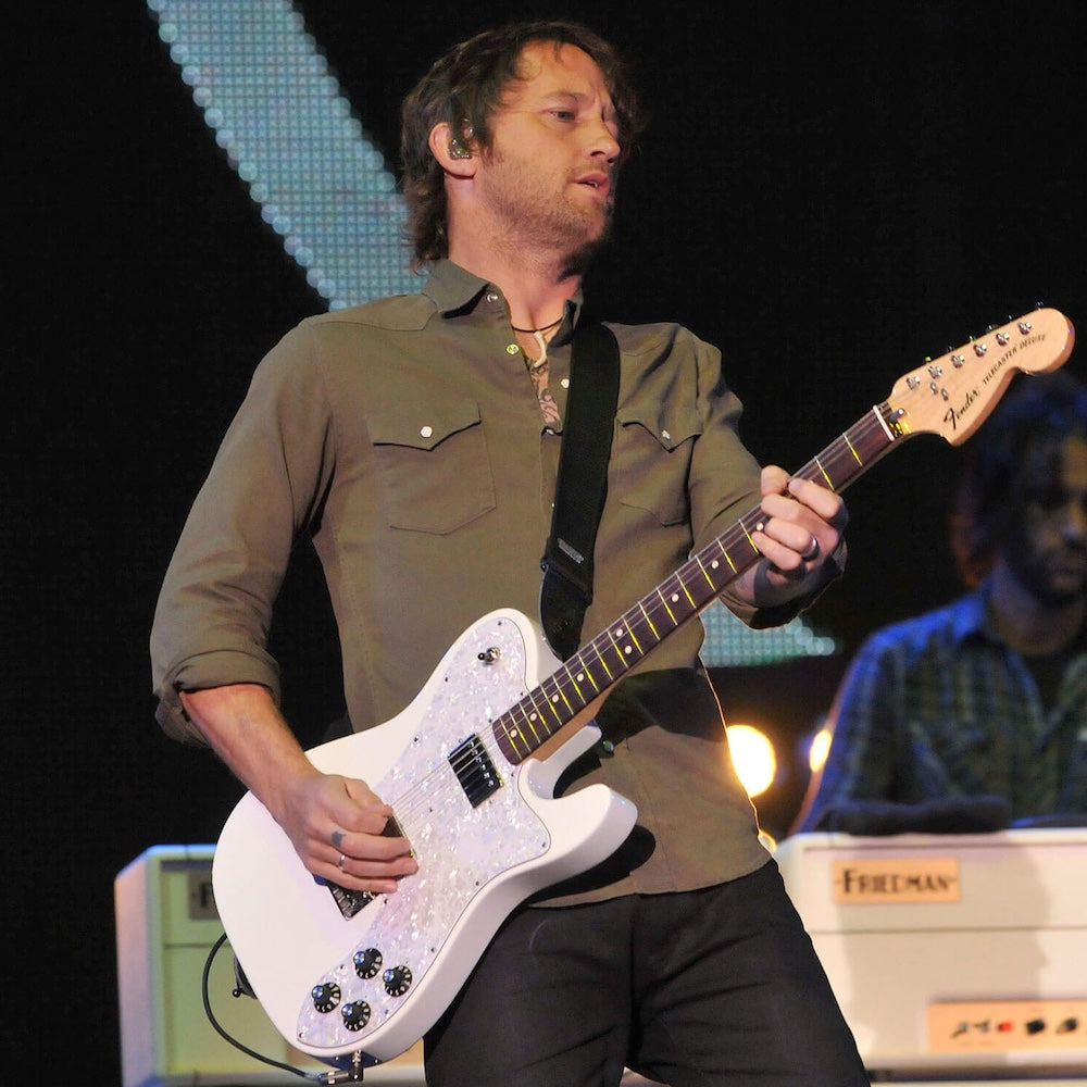 Chris Shiflett playing a Gold electric guitar on stage with a blurred background