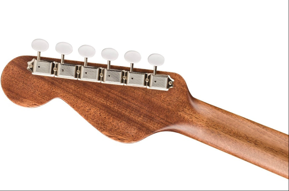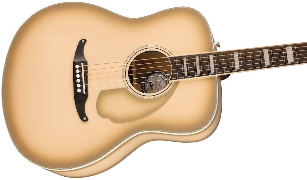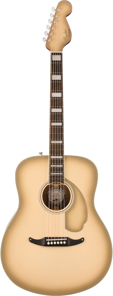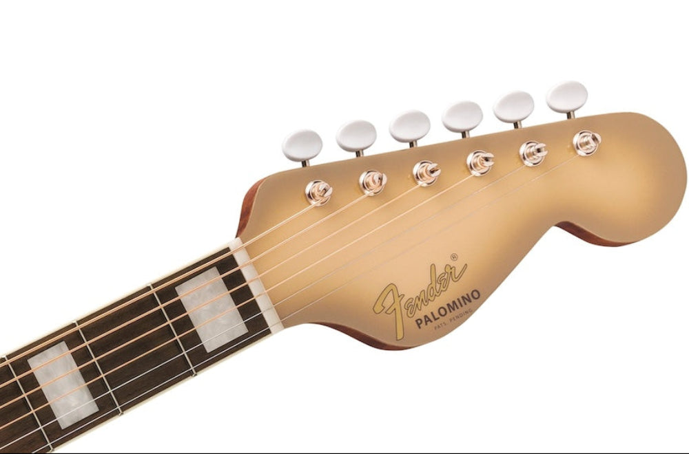 Engineered with an innovative Performance X bracing pattern, the mid-size auditorium body of the Fender California Vintage Palomino is lightly crafted with a solid Sitka spruce top and solid ovangkol back and sides to effortlessly produce a versatile, articulate voice with exceptional detail, clarity and balance. An ergonomic modern "V" profile was chosen for the the okoume neck along with a 25.5" scale length for optimal sustain, and a tilt-back 6-in-line headstock with a matching headcap for a distinctive look born from Fender's electric guitar DNA. Other notable details include a bound ovangkol fingerboard with pearloid block inlays for a throwback look, vintage-style tuning machines for smooth, accurate tuning, and a bone nut and saddle for superior harmonic character. Designed for the performer, the onboard Fishman Presys VT Plus preamp system features seamless soundhole-mounted controls that blend an undersaddle piezo and internal body transducer to allow faithful and reliable reproduction of the guitar's natural sound when plugged into an amplifier or recording device. A vintage-style hardshell case is included. • Period-correct Palomino auditorium body shape • Solid Sitka spruce top, solid ovangkol back and sides • Ergonomic modern "V" shape neck with tilt-back 6-in-line headstock • Fishman Presys VT Plus electronics with undersaddle piezo and internal body transducer • Vintage-style hardshell case • MFSKU 0971042388 • UPC 885978171101