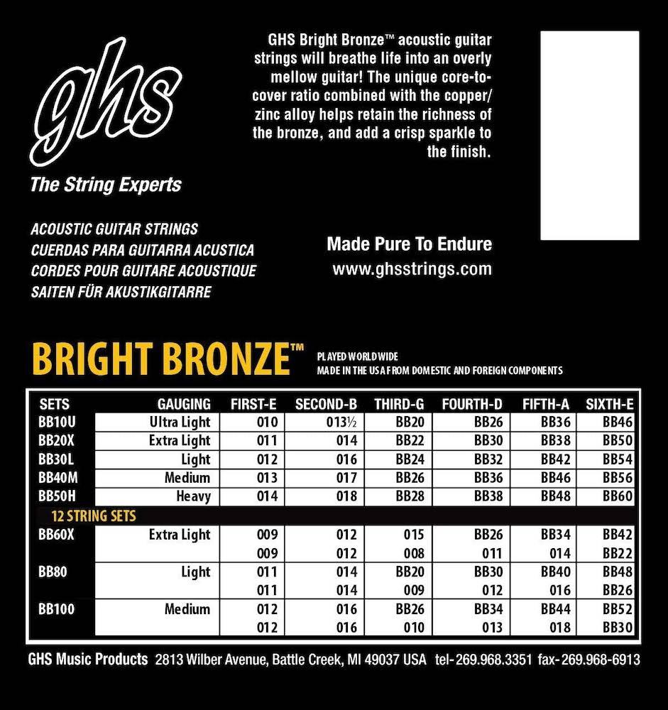 GHS BB40M Bright Bronze Acoustic .013-.056 Crispy sparkle, Lush TONES! Breathe life into an overly mellow guitar! The unique core-to-cover ratio combined with the copper/zinc allow helps retain the richness of bronze and add a crisp sparkle to the finish. • MFSKU BB40M • UPC 737681005542