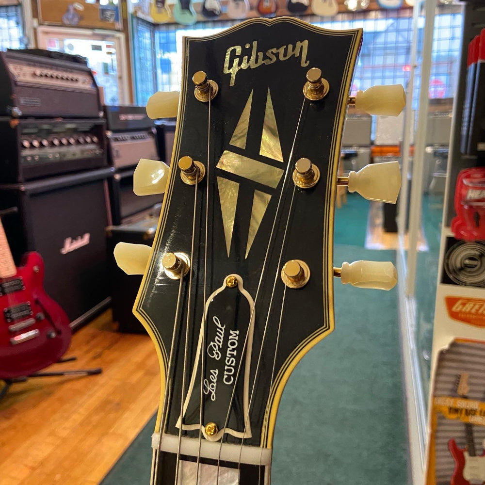 From the Historic Collection.. Step into the golden era of rock with the Gibson 1957 Les Paul Custom, meticulously recreated in a Murphy Lab Ultra Light Aged Ebony finish. This iconic electric guitar pays tribute to the classic '57 model, showcasing unparalleled craftsmanship and vintage aesthetics. The Ultra Light Aged treatment imparts a tasteful relic look, providing the Les Paul Custom with the character and vibe of a seasoned classic. The resonant mahogany body, carved maple top, and '50s rounded neck profile offer an authentic playing experience, true to the original. Powered by two humbucking pickups, this Les Paul Custom delivers the rich, articulate tone that has defined countless genres. The Murphy Lab's attention to detail ensures that every nuance of the vintage design is faithfully reproduced. Secure your investment with the included hard case, reflecting the same dedication to quality as the guitar itself. Whether you're a collector, performer, or both, the Gibson 1957 Les Paul Custom stands as a testament to the enduring legacy of Les Paul guitars. Elevate your sound and style with this Murphy Lab Ultra Light Aged masterpiece - a timeless tribute to the golden age of rock 'n' roll. • MFSKU LPB57ULEBGH1 • UPC 711106050256