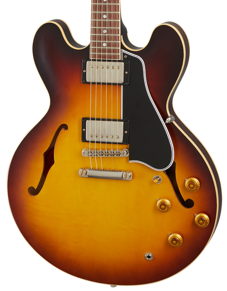 Rediscover the magic of the past with the Gibson 1959 ES-335 Reissue VOS - an exquisite electric guitar presented in Vintage Burst, accompanied by a deluxe case. Meticulously crafted by the expert artisans at Gibson Custom Shop, this Historic Reissue ES-335 surpasses expectations. A year of studying, scanning, and listening to original examples has resulted in every contour, profile, inlay, and color being rendered in magnificent detail. The outcome is an unparalleled playing and ownership experience that beckons you to return for more. The 1959 Reissue models showcase rounded cutaways, Medium C-shape neck profiles scanned from originals, dot inlays, and vintage-replica parts. This commitment to authenticity ensures that each note resonates with the timeless essence of the vintage models that inspired them. Whether you're a collector or a discerning player, the Gibson 1959 ES-335 Reissue VOS promises an immersive experience—a fusion of history, craftsmanship, and sonic excellence. • MFSKU 59ES335VOVBNH1 • UPC 711106024547