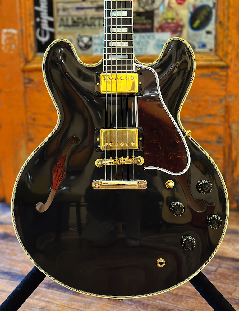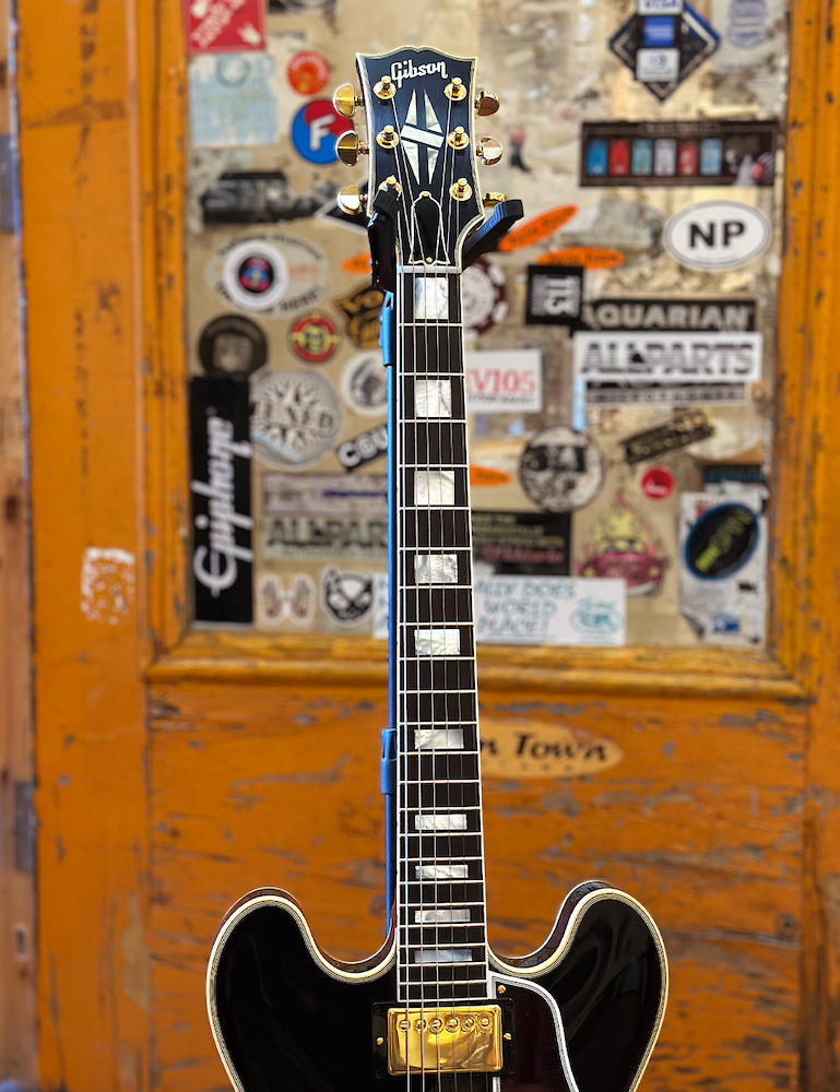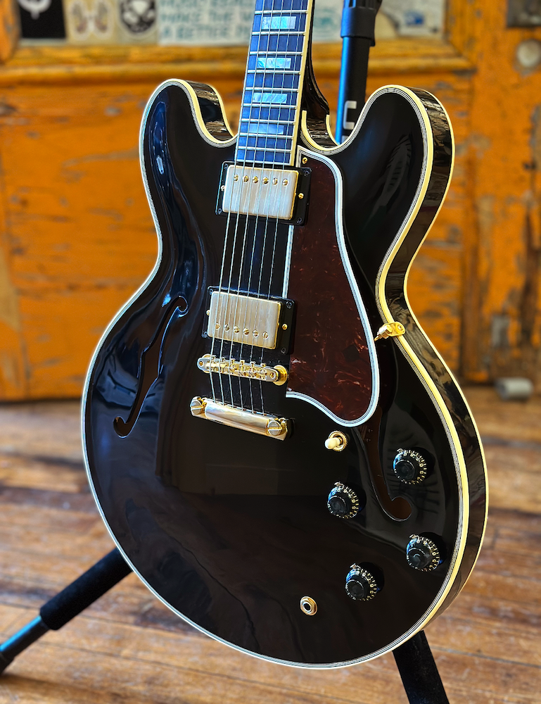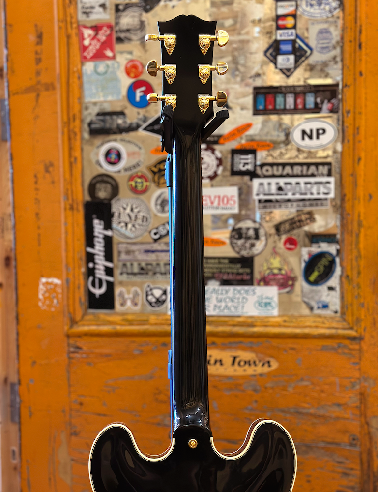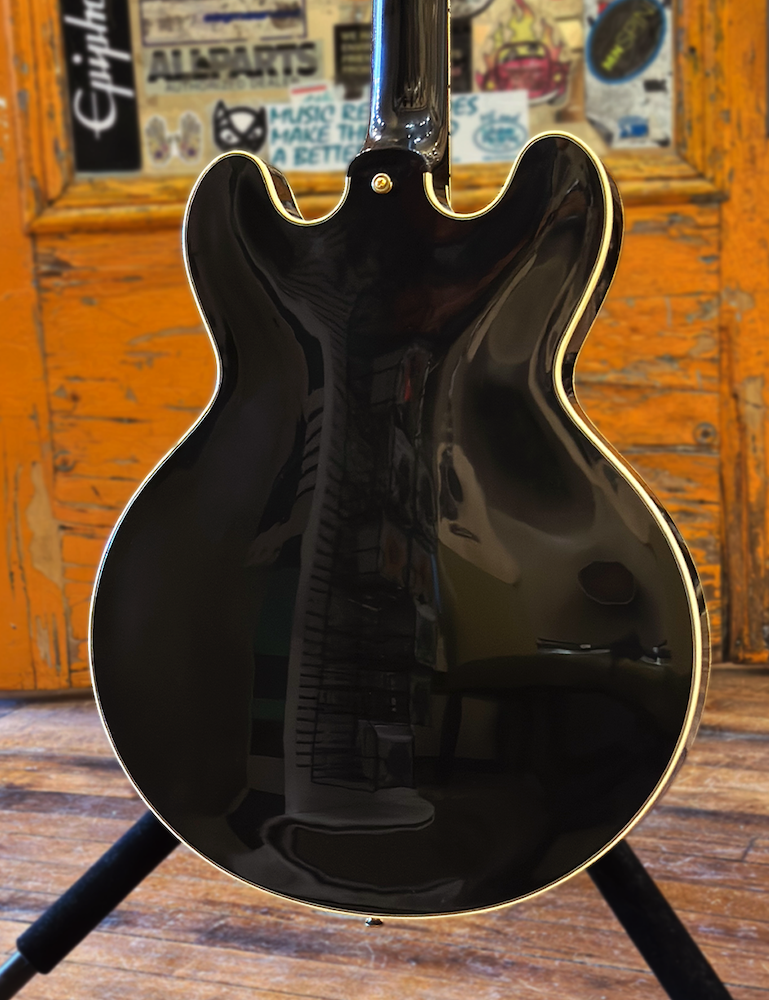 Here at Twin Town Guitars, we are proud to introduce the Gibson 1959 ES-355 Reissue—a stunning reproduction of one of the greatest guitars ever to be made. With its cool VOS Ebony finish, this reissue reflects the vintage looks and timeless tone of the 1959 ES-355 original, yet maintains the modern playability you expect from a high-end Gibson Custom guitar.